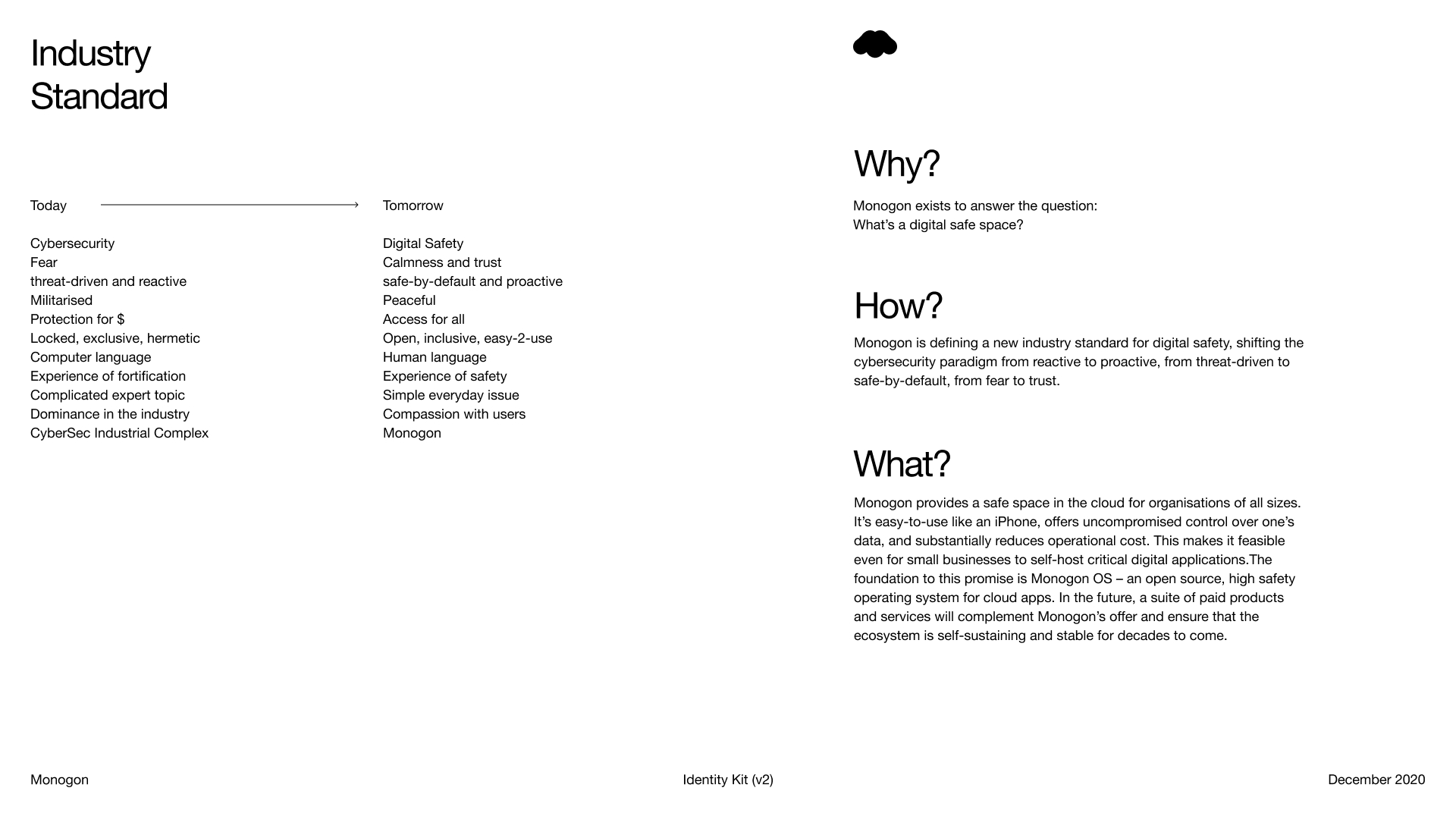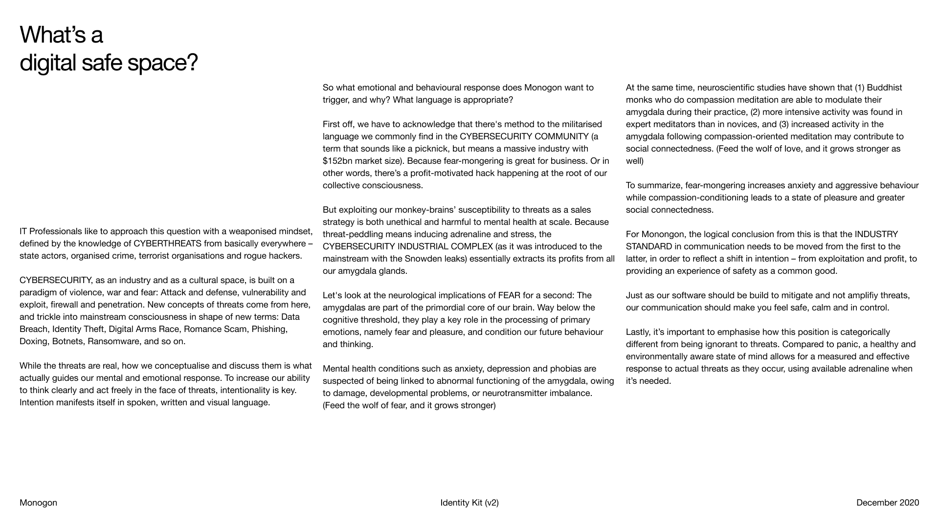 Neo-Metabolism developed the narrative and visual identity for Monogon, providing an alternative to the militarised language and the mindset, with the aim to bring peace to users, and admins.