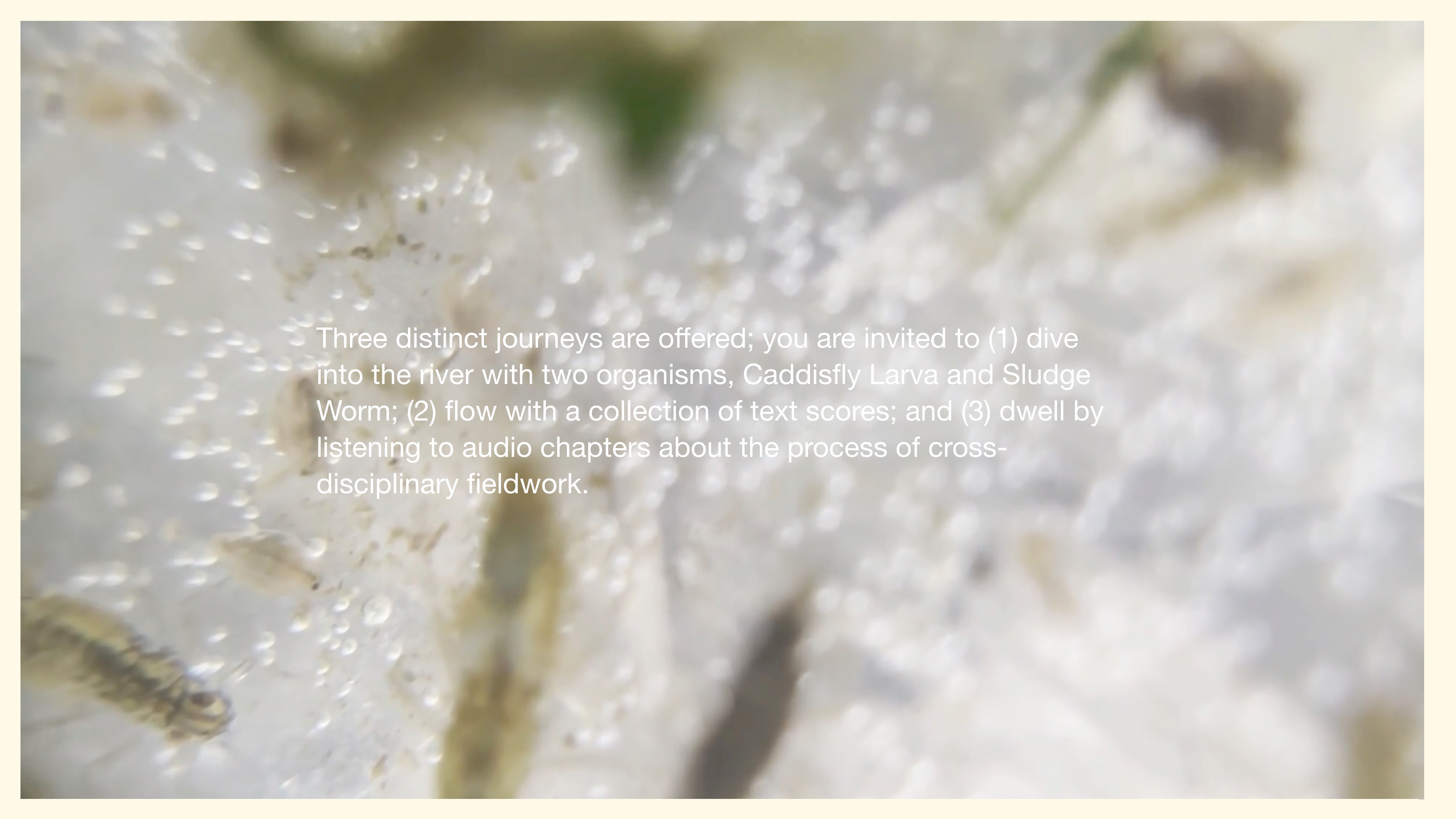 Sensitives Stream highlights the importance of river dwelling organisms and how their presence or absence indicates signicifant stories about ecosystems, environmental stress, and human activity. This project was created by London-based artist duo Matterlurgy, to increase awareness of the human entanglement with the environment, and to investigate more-than-human ways of knowing. The project enables multi-sensory, embodied ways of engaging with the river and its organisms, and teaches alongside this, about river health and toxicity.